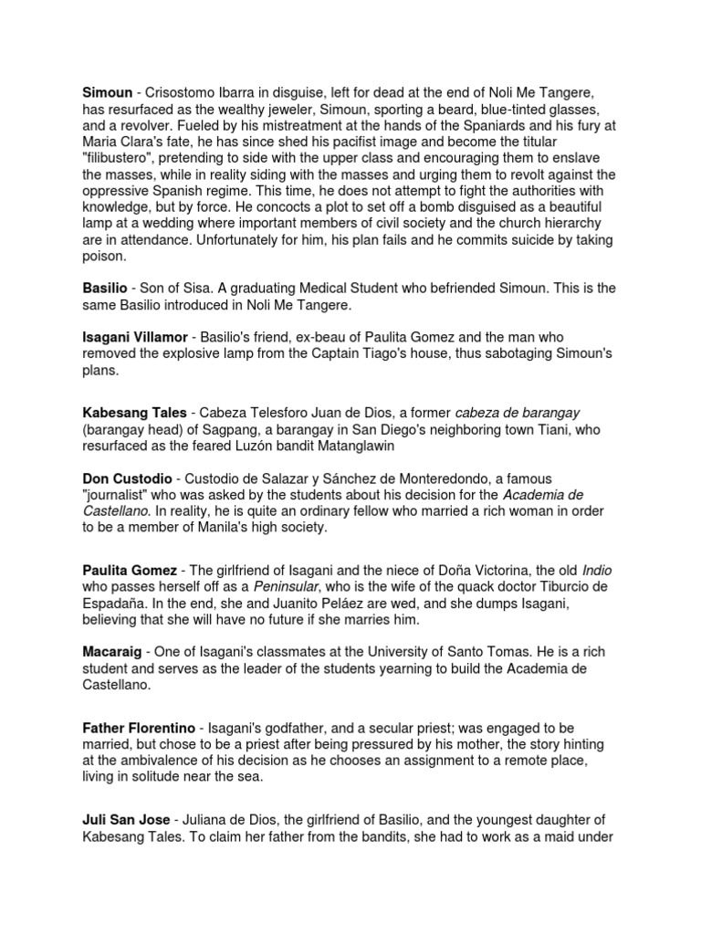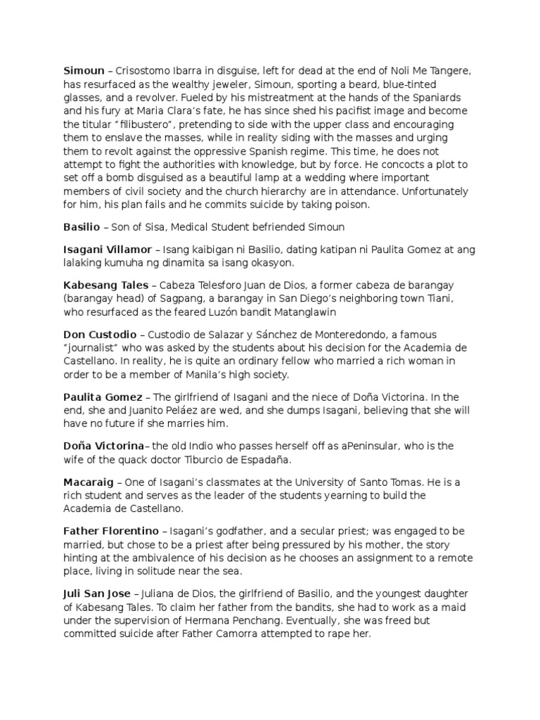 Siya ay ang amo at ang pinaglilingkuran ni Juli na siya namang anak ni. Like Noli Me Tangere it was written in Spanish. Below are some of the major and minor characters in the novel.