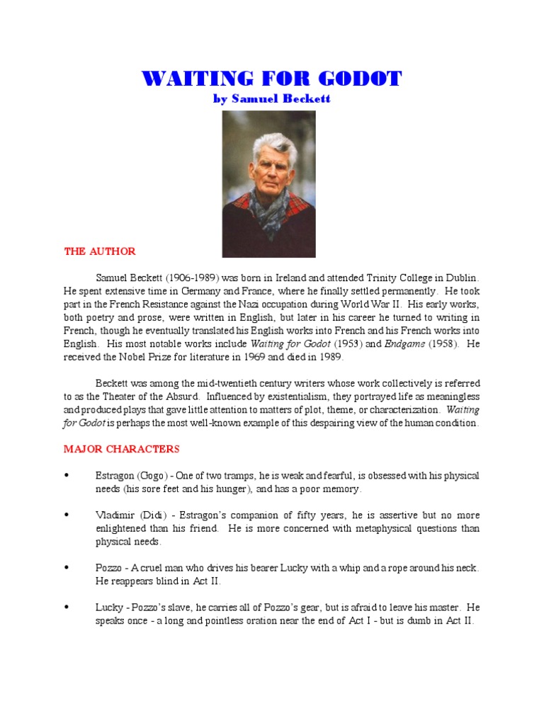 Vladimir and Estragon passing the time waiting for the elusive Godot Lucky and Pozzo turning up and then leaving and the Boy arriving with his message. This play falls under tragedy and comedy. Waiting for Godot study guide contains a biography of Samuel Beckett literature essays quiz questions major themes characters and a full summary and analysis.