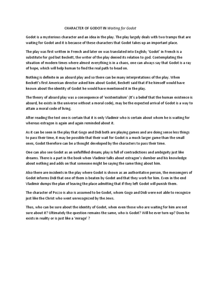 Learn all about how the characters in Waiting for Godot such as Estragon and Vladimir contribute to. Breaking into Waiting for Godot is super daunting but the solution is to just dive in. Both times he tells Vladimir and Estragon that Godot is not coming but will come the next day.